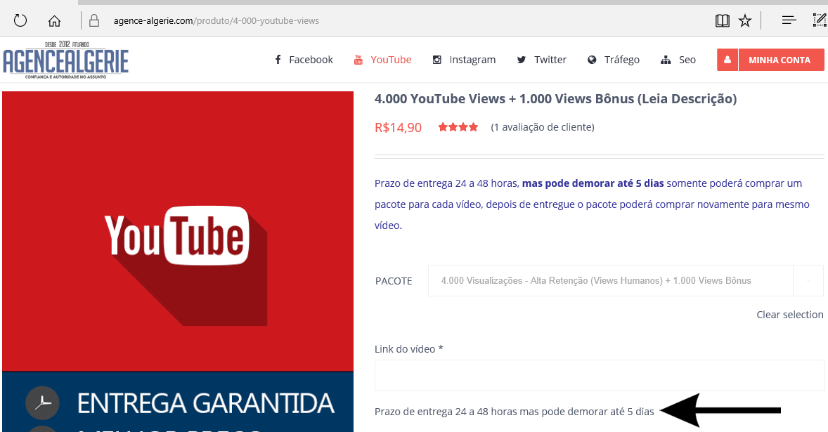 Para sabe mais você pode visitar nossa pagina https://agence-algerie.com/categoria-produto/youtube/ o prazo de entrega de cada pacote de views também pode ser encontrado na descrição do produto conforme mostra nessa imagem abaixo.